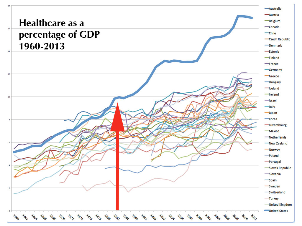 As economies grow in absolute size, they tend to dedicate a greater percentage to health care. After a certain point, somewhere around 9 percent, the cost continues to increase, but the rate of increase tends to flatten somewhat. Through the ’60s and ’70s we can see that happening. The United States, as the largest economy, is one of the most expensive, but it’s just there at the top of the pack. In the mid-1960s Medicare is implemented — the first big infusion of federal money into the health care economy — and does the U.S. line jump up? Not really. It flatlines for a year, then continues its moderate climb.